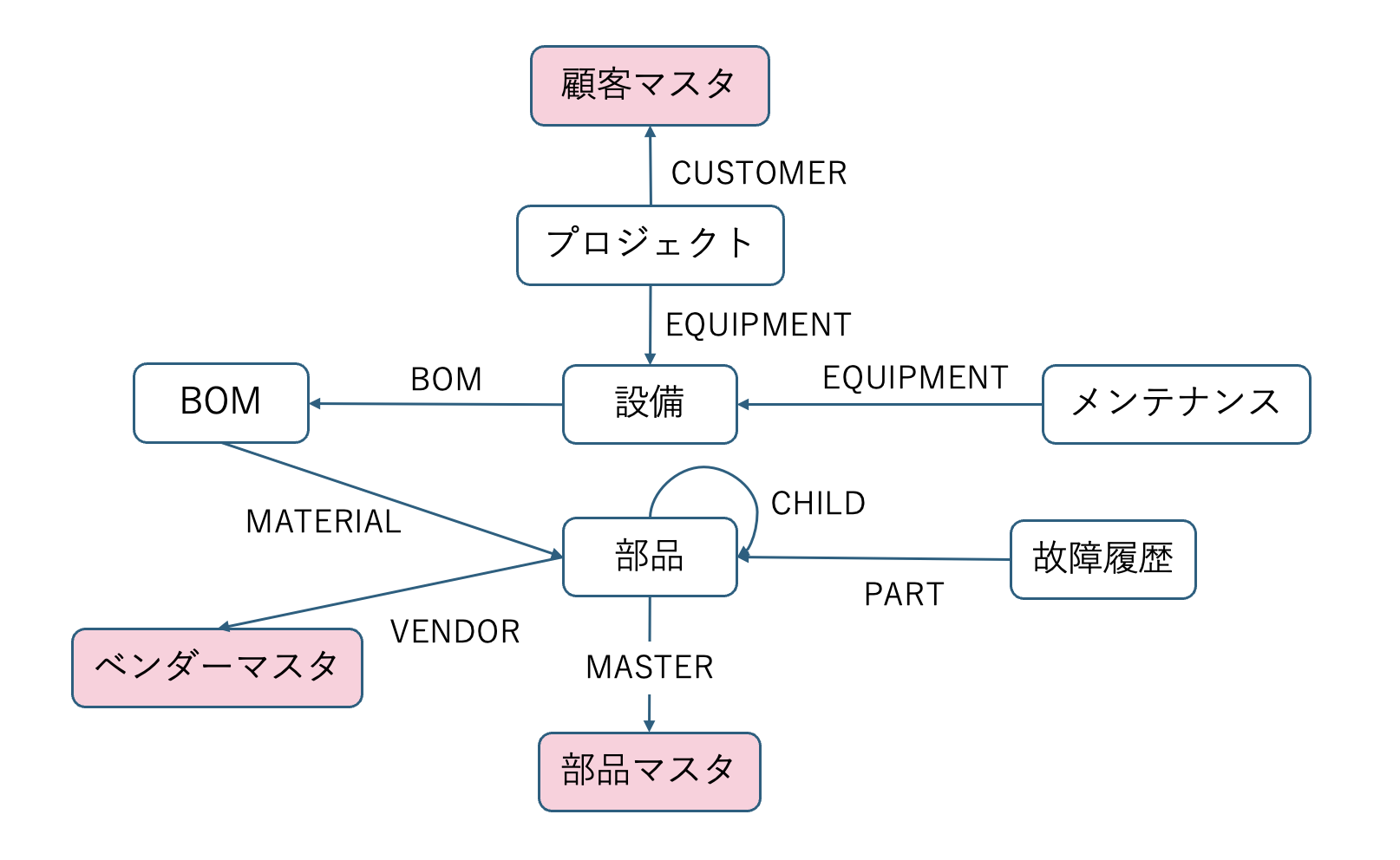 取得したスキーマの例:(:Project)-[:CUSTOMER]->(:CustomerMaster) (:Equipment)-[:BOM]->(:BOM) (:BOM)-[:MATERIAL]->(:Part) (:Part)-[:MASTER]->(:PartMaster)